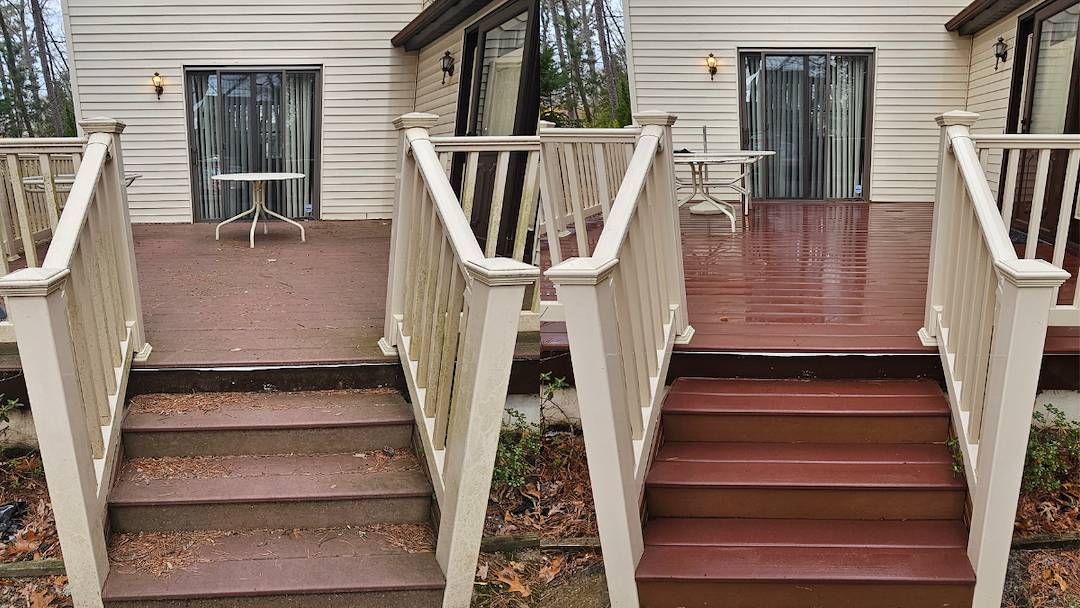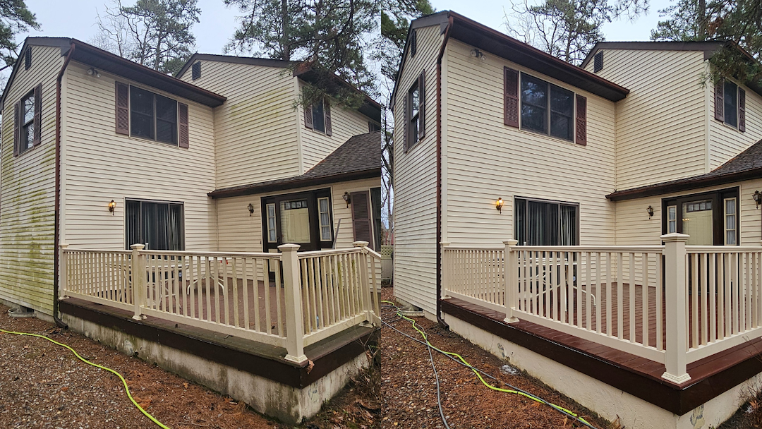 Vantage Exterior Solutions, Brick Township’s trusted house washing and soft wash provider, completed a comprehensive exterior cleaning for a homeowner in the Cedarcroft section of Brick, NJ. The property was being prepared for sale and showed significant buildup across the siding, vinyl railings, and deck. Using our professional soft wash system, we applied a biodegradable cleaning solution designed to safely remove algae, mildew, and dirt from every surface—without the risk of damage from high pressure. The siding was brightened to a like-new finish, the railings regained their clean white appearance, and the deck was restored to a smooth, even tone. The transformation was immediate and dramatic, turning a neglected exterior into a clean, inviting space that boosted curb appeal and market readiness. This project demonstrates how professional exterior cleaning not only enhances visual presentation but also increases the perceived value of a home to potential buyers.