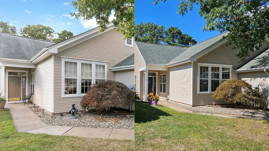 Vantage Exterior Solutions, Brick Township’s trusted roof and exterior cleaning specialist, completed a full-property transformation in the Four Seasons community near Lakewood, NJ. This project was especially meaningful, as it was completed for the owner’s mother—someone who, like many homeowners in the area, had been told her roof needed replacement after dark streaks and algae appeared across the shingles.